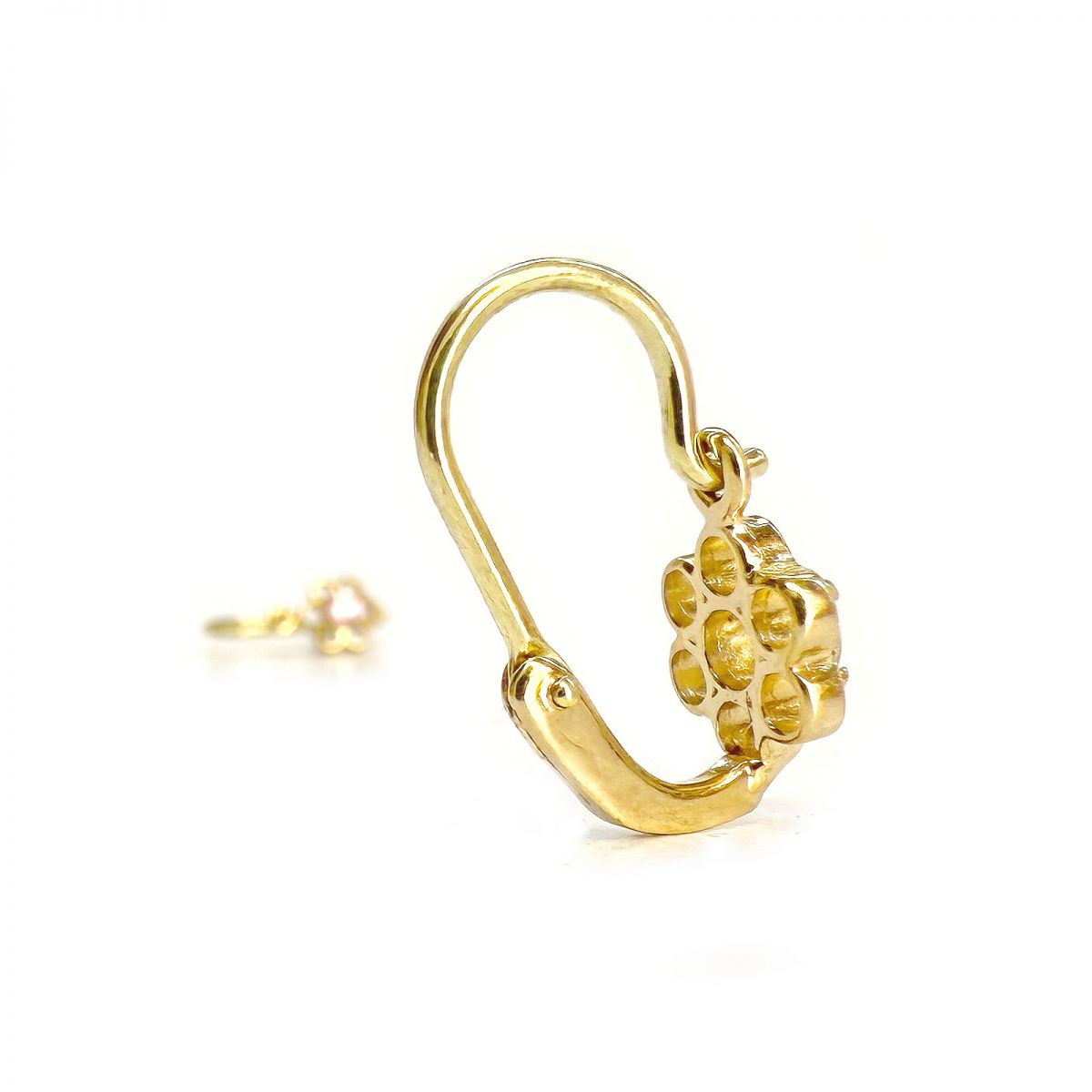 Ez a 14 karátos aranyból készült baba fülbevaló finoman áttört virágmintával és középen elhelyezett, ragyogó rózsaszín kővel készül. A játékos forma és a pasztell szín kombinációja különösen kedvessé és egyedivé teszi ezt az ékszert. Az előlkapcsos zár biztonságos, kényelmes viseletet nyújt, így ideális választás kisbabák számára. Tökéletes ajándék keresztelőre, babalátogatásra vagy születésnapra – egy fülbevaló, ami éveken át örömet szerez.