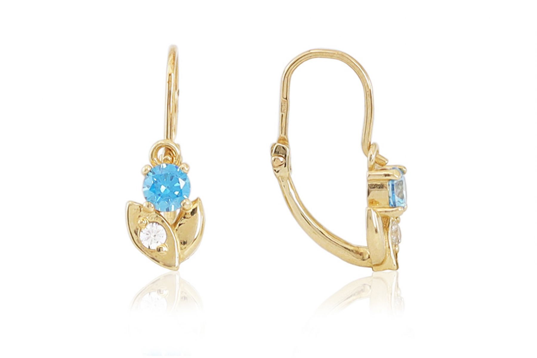 Amennyire aprócska, annyira szép és elegáns ez a szikrázó világoskék és fehér cirkónia kövekkel díszített arany elölkapcsos virágos fülbevaló.