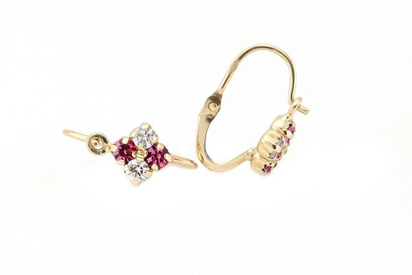 Arany gyermek fülbevaló elölkapcsos négyköves pink-fehér