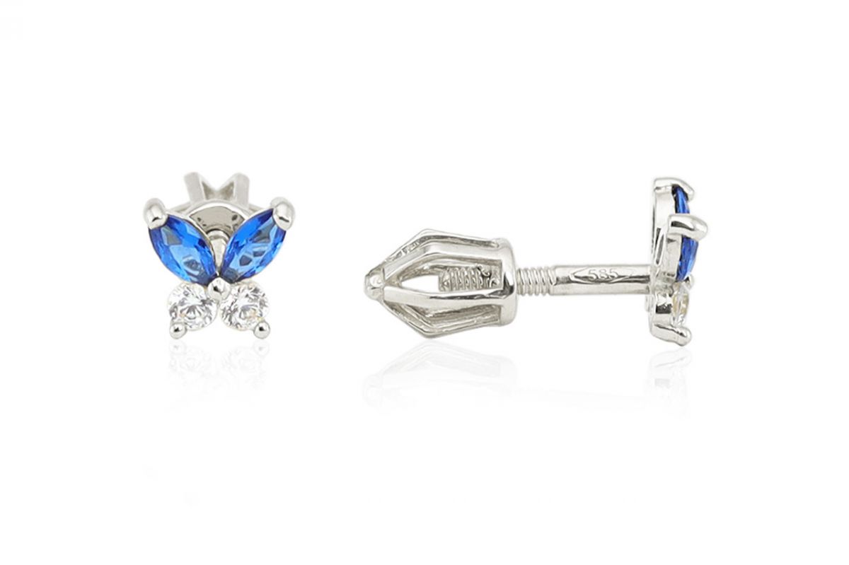 Fehér arany baba és gyermek fülbevaló csavaros pillangó kék és fehér kövekkel