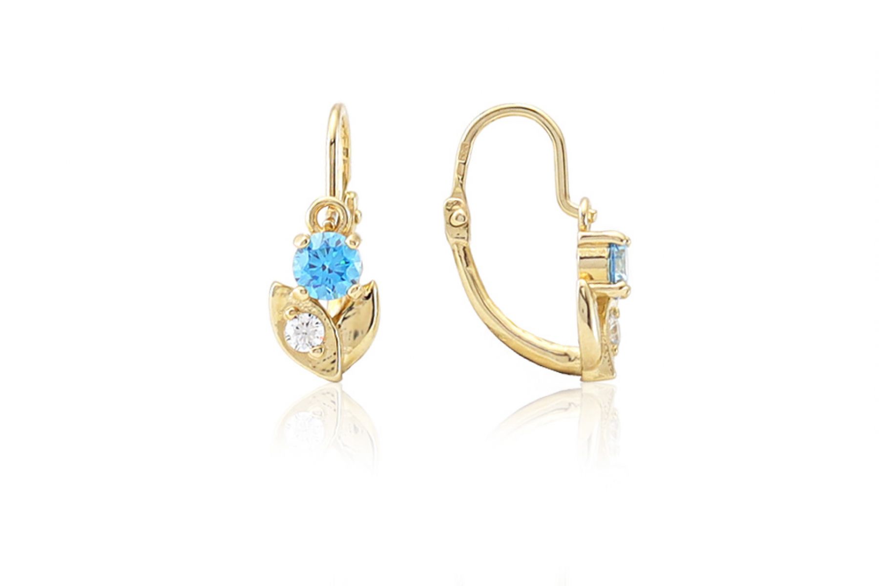 Amennyire aprócska, annyira szép és elegáns ez a szikrázó világoskék és fehér cirkónia kövekkel díszített arany elölkapcsos virágos fülbevaló.