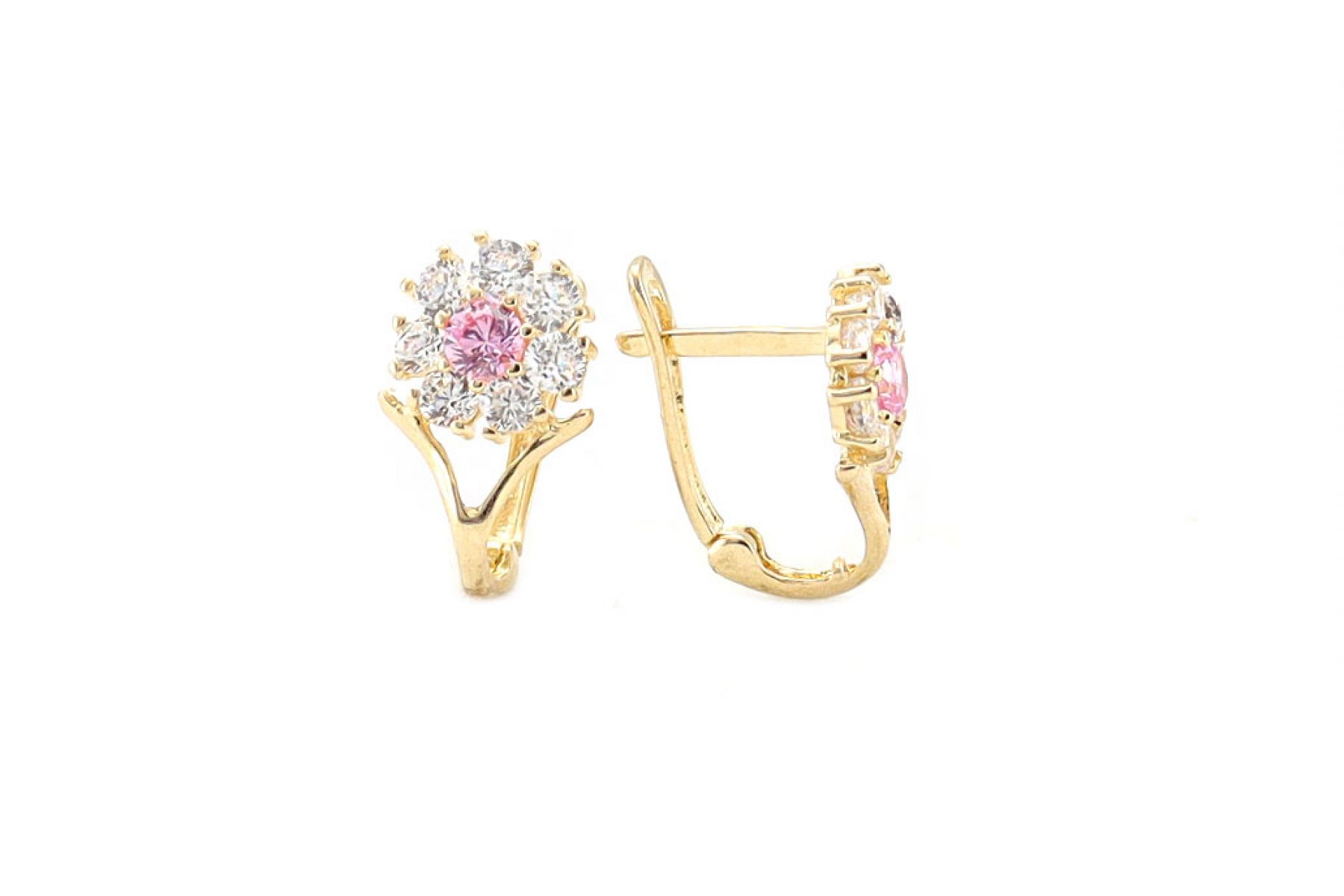 Arany baba fülbevaló franciazáras virág íves szárral rózsaszín-fehér kövekkel