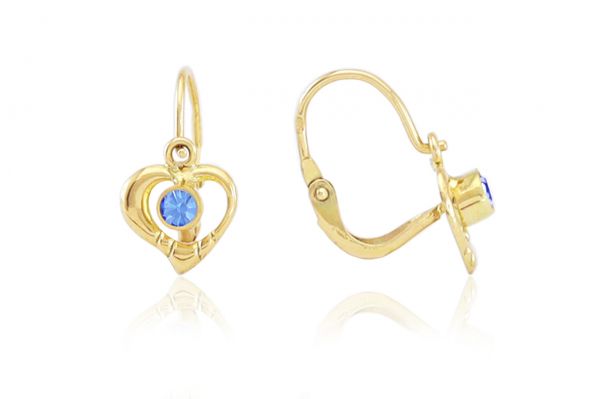 Arany gyermek fülbevaló elölkapcsos asszimmetrikus szívecske világoskék kővel