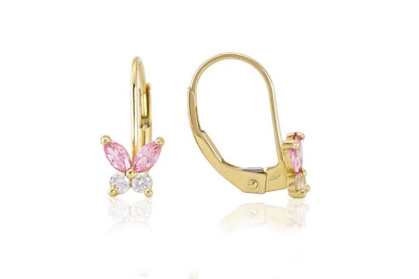 Amennyire aprócska, annyira szép és elegáns ez a szikrázó rózsaszín és fehér cirkónia kővel díszített arany pillangó mintás fülbevaló.
