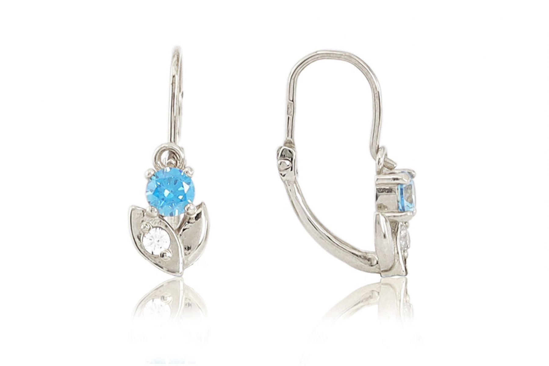 Amennyire aprócska, annyira szép és elegáns ez a szikrázó világoskék és fehér cirkónia kövekkel díszített arany elölkapcsos virágos fülbevaló.
