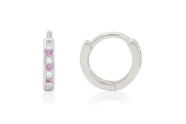 Rózsaszín és fehér köves baba ezüst fülbevaló bepattintós keskeny karika