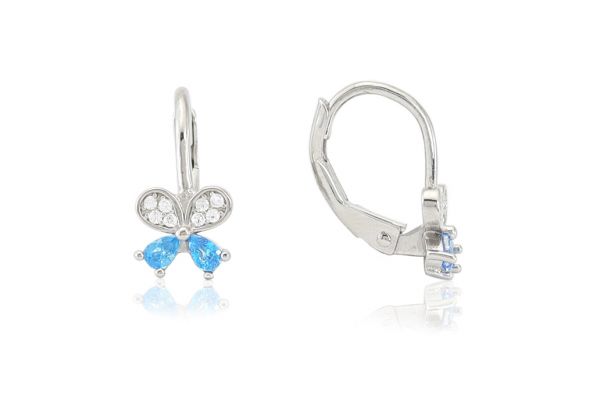Ezüst gyermek fülbevaló patentzáras pillangó világoskék és fehér kövekkel